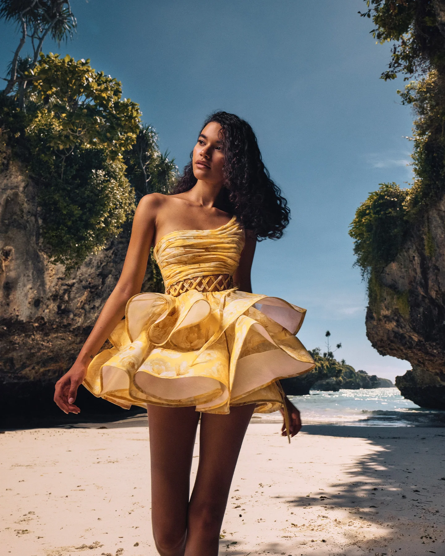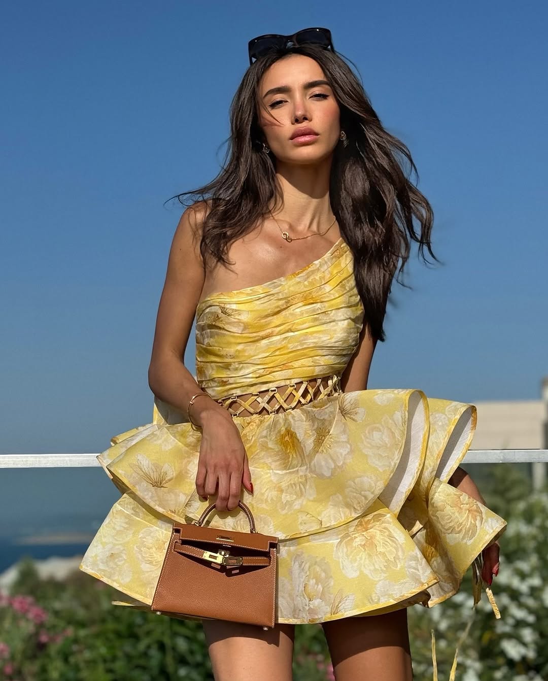Whether you’re dressing for an outdoor engagement party, a weekend brunch with a view, or an evening vacation dinner somewhere warm, Solene fits the mood. It’s a dress designed to be noticed, but never loud. A look that photographs beautifully from every angle—especially that side profile where the shoulder line, waist curve, and flared hem all come into view.