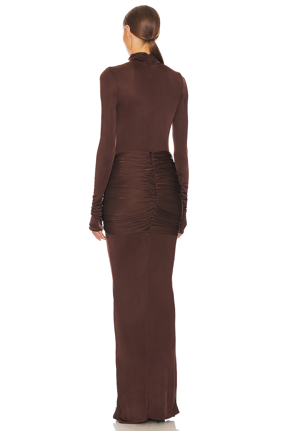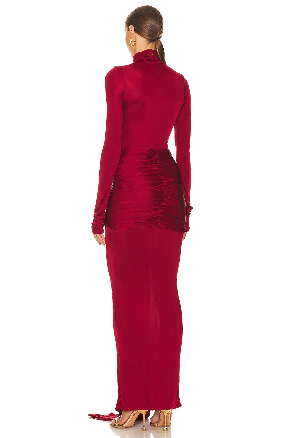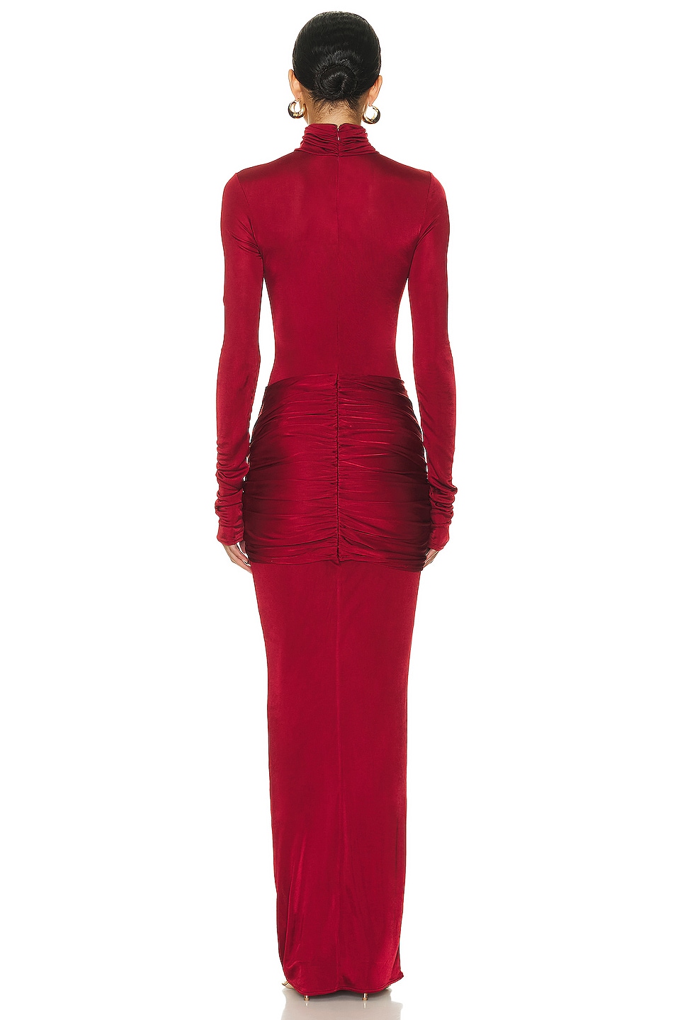 The dress is made from a sumptuous jersey fabric that hugs the body for a flattering silhouette. The high turtleneck adds a touch of classic chic, enhancing the overall sleek appearance and ensuring you stand out in any crowd.