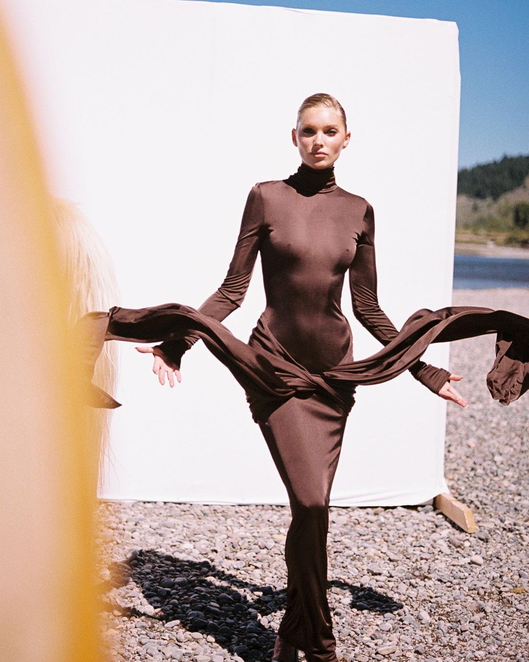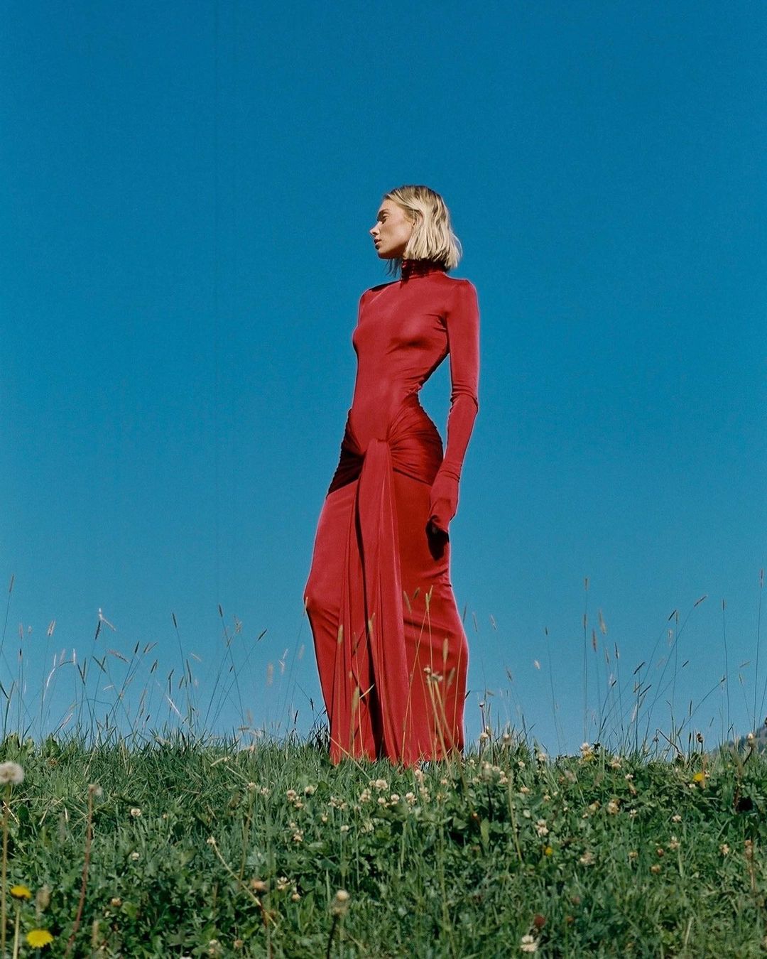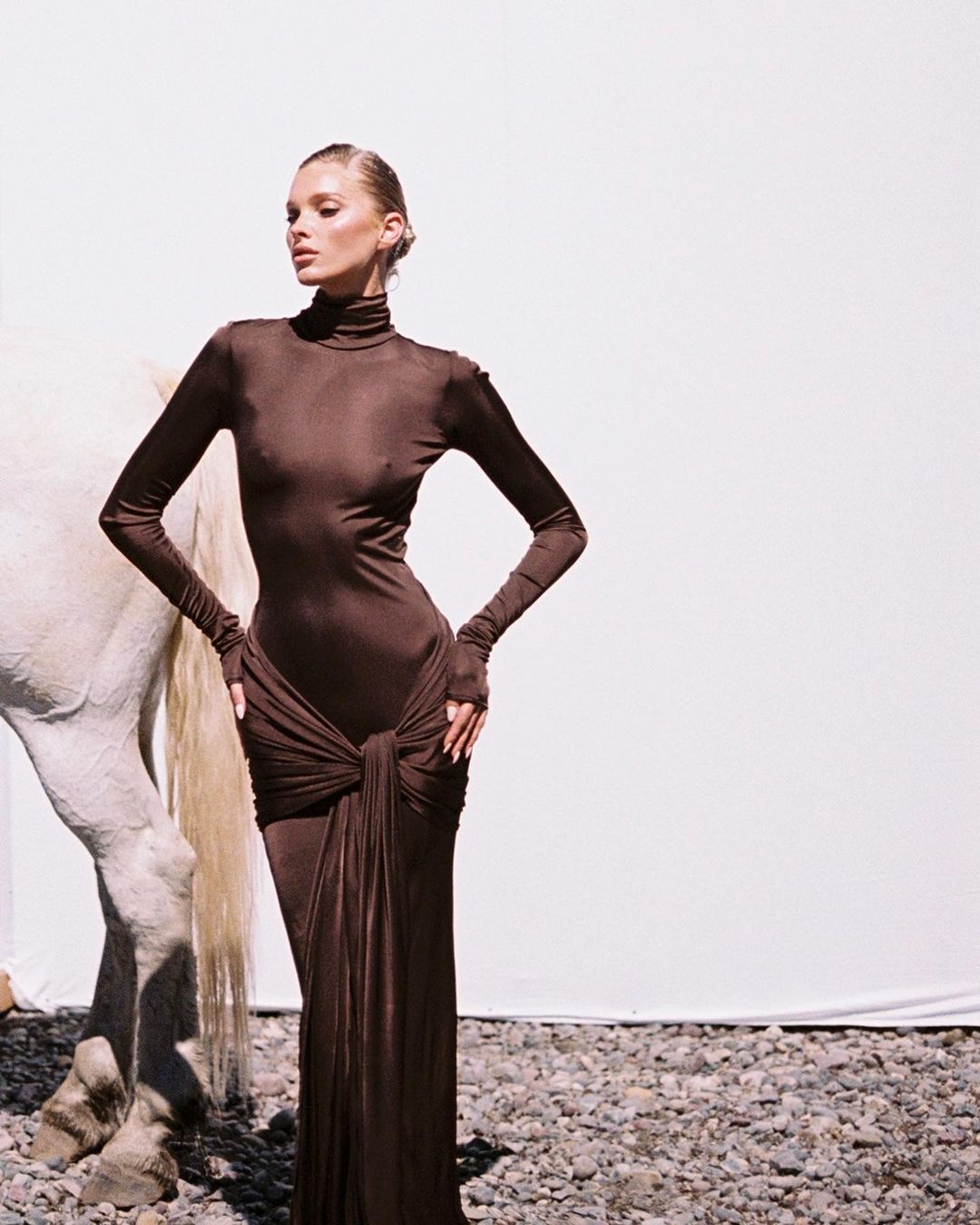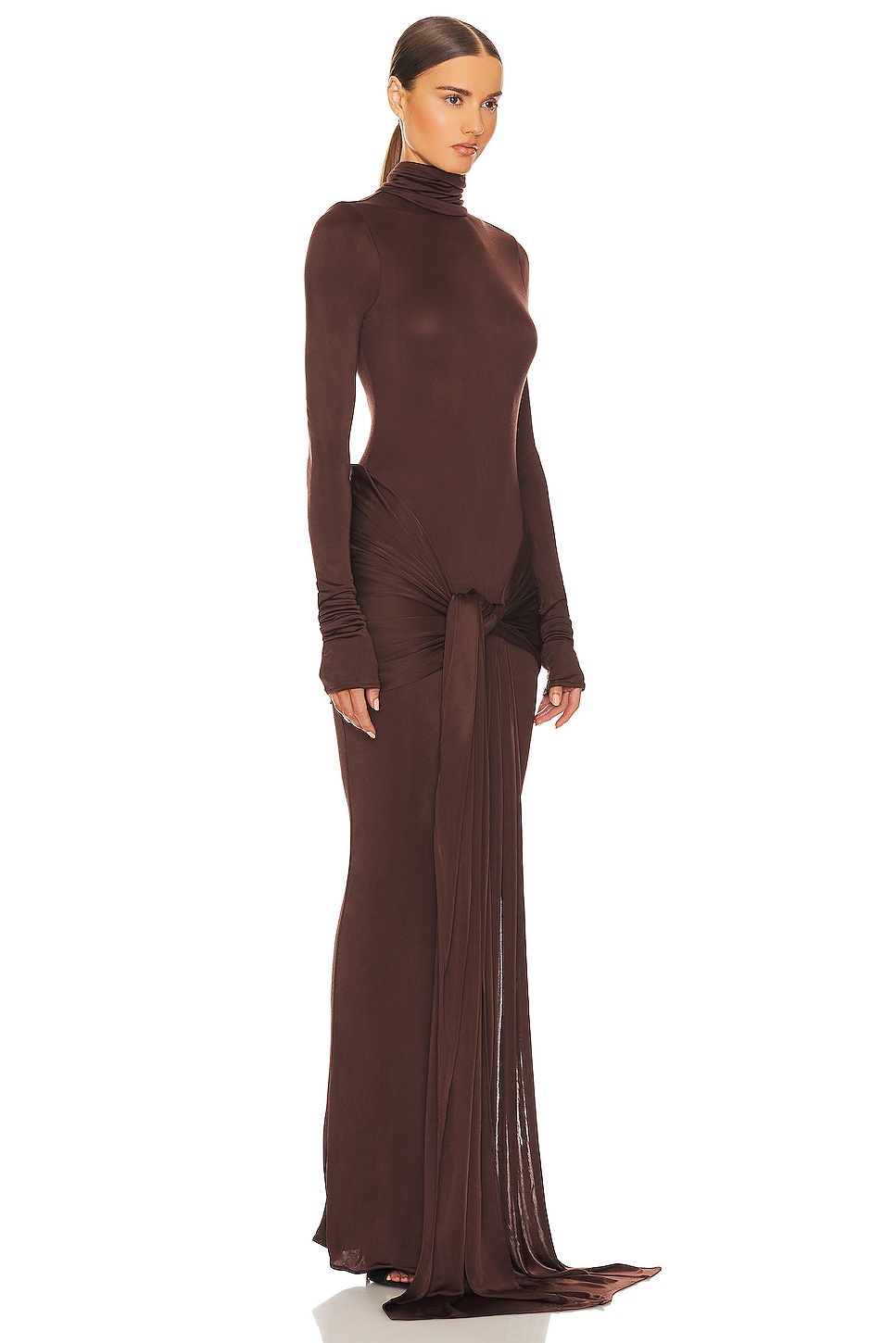 The dress is made from a sumptuous jersey fabric that hugs the body for a flattering silhouette. The high turtleneck adds a touch of classic chic, enhancing the overall sleek appearance and ensuring you stand out in any crowd.