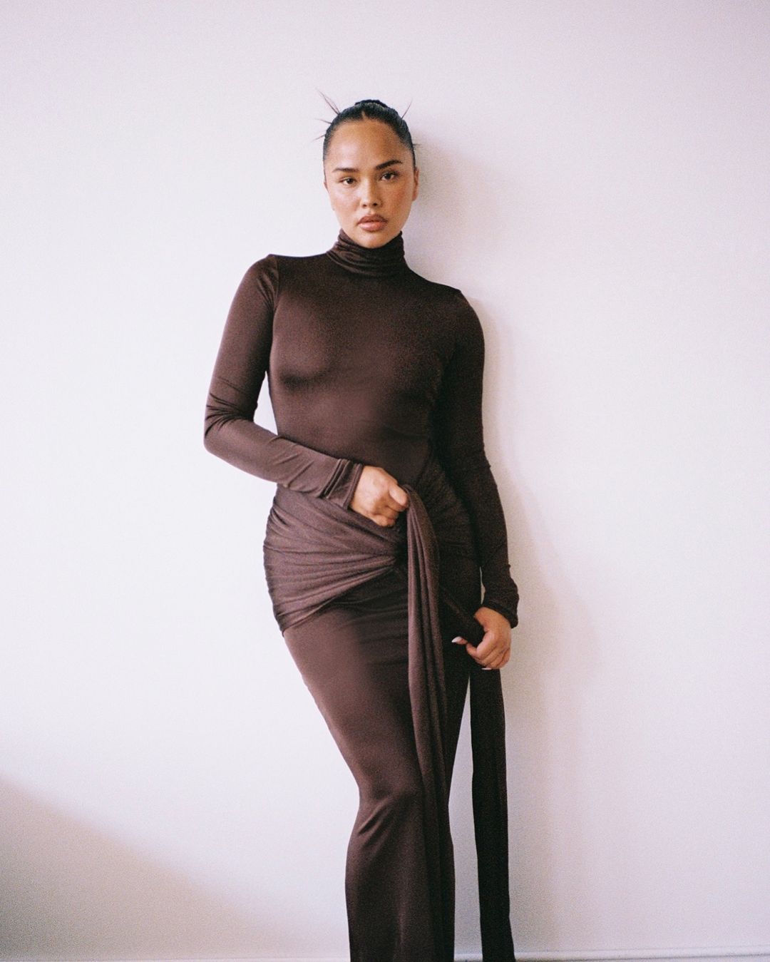 A unique feature of this slinky sarong dress is its integrated sarong panel with ruched detailing and a tie at the front, providing adjustable coverage and a customizable look. This versatile element allows the dress to easily transition from a daytime to an evening look, adapting to your style needs with ease.